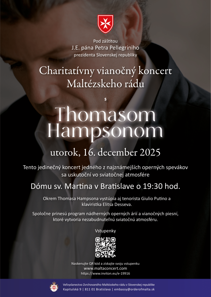 Zvrchovaný Maltézsky rád pozýva na vianočný charitatívny koncert výnimočného amerického barytonistu Thomasa Hampsona, ktorý sa uskutoční v utorok 16. decembra o 19.30 hod. v Katedrále sv. Martina v Bratislave. Thomas Hampson účinkoval na najprestížnejších operných scénach sveta, vrátane Metropolitnej opery v New Yorku, La Scaly v Miláne a Viedenskej Štátnej opery. Viac informácií o koncerte a možnosti zakúpenia lístkov nájdete na plagáte na výveske.